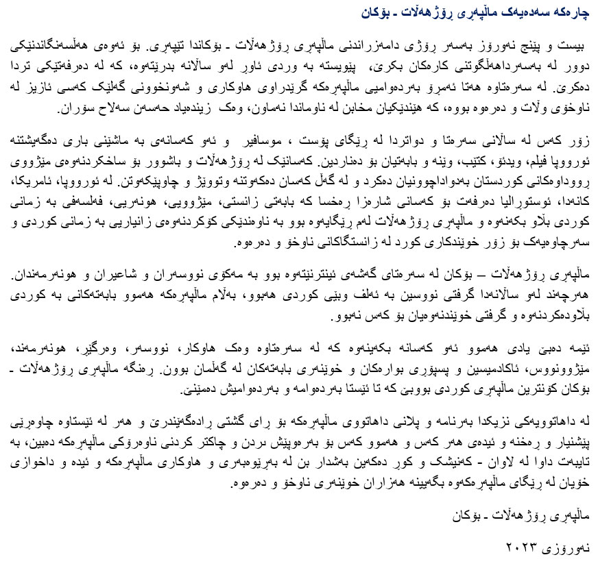 ماڵپهڕی رۆژههڵات/ بۆکان له ساڵی ١٩٩٨ ی زایینی له ئورووپا دهستی به کار کرد. ئامانجی ئێمە لە دامەزراندنی ماڵپەڕەکە، ئاگاداری بهخشینی ڕاستگۆیانە و بڵاوکردنهوهی بابهتی ئهدهبی، هونەری، مێژوویی، فهلسهفی و زانستی و تا رادهیهکیش سیاسی بوو لەپێوەندی کوردستان و کورد دا. ههوڵی نووسهرانی ماڵپهڕهکه لە یەکەم ڕۆژەوە تا ئێستا ئهوه بووه بە گوێرەی دەرەتان ماڵپەڕەکە بکەنە سەکۆیەک بۆ بانگی حەق و ئاوێنەیەک بۆ نواندنی مافەکانی مرۆڤی کورد لە هەموو پارچەکانی کوردستان. دیارە ئێمە هەموو خاڵەکانمان نەپێکاوە و ناتەواویمان هەیە کە لێی ئاگادارین، بەڵام بەختەوەرین بڵێین دەستمان بەڕووی هیچ نووسەرێکەوە نەناوە کە بابەتێکی سەرنجڕاکێشی لە هەرکام لەوبوارانەی سەرەوەدا بۆ ناردبێتین بەمەرجێک کە ڕادەی کارەکە لەسەرەوە بووبێت و تێیدا هێرش و سووکایەتی نەکرابێتە سەر ئەندامانی کۆمەڵگا. دیارە بڕیار لەسەر ئێمە و کارەکانمان دەبێ خەڵکانێک بیدەن کە سەردانی ماڵپەڕەکە دەکەن، بهڵام لەبیرمان نەچێت کە ئەوە هەرەوەزێکی خۆبەخشانەیە و تەنیا کەسانی خۆبەخشن کە بابەتمان بۆدەنێرن، کاتێکیش کە بارودۆخی دژواری ژیان له دهرهوی وڵات دەگرینە بەرچاو، دەبینین نووسەرانی ماڵپەڕەکە لەڕادەی توانا و گونجاوبوونی کات و دەرەتاندا، ئەگەر زیاد لەڕادەی پێویست کاریان نەکردبێت، کەمتریان نەکردووە. لە ئەرکی ئێمەدا، گرنگ پاراستنی هەندێک ئوسووڵ و لانەدان لە ڕێبازی خزمەت بە گەل و نیشتمان و ئامانجی پێشکەوتنخوازانە و دادپەروەرانە و خۆپاراستن لە حزبایەتی و لایەنگریی و هەڵاواردن بووە و هیوادارین خوێنەر و بینەری ماڵپەڕەکە لە بینینی بابەتەکانی نووسەرانی ڕۆژهەڵات/ بۆکاندا هەستیان بەو ڕاستییە کردبێت. لە هەڵبژاردنی بابەتی ماڵپەڕەکانی دیکەشدا هەموو هەوڵمان ئەوە بووە ئەو ئەسڵانەی سەرەوە بپارێزین و گوڵبژێری سەرچاوەی هەمەچەشنە بکەین کە لەگەڵ زەوق و خواستی کۆمەڵانی بەرینی خەڵک و مەسڵەحەتی نیشتمانەکەماندا یەک بگرنەوە. ئاشکرایە دەبێ ئامانجە پێشکەوتنخوازەکان لە نووسینی نووسەرانی ماڵپەڕەکە و بابەتی هەڵبژاردەی سەرچاوەکانی دیکەشدا ڕەنگیان دابێتەوە و چەوساندنەوە و بێعەداڵەتی کەوتبێتنە بەر ڕەخنەی دوور لە هێرشکاری و سووکایەتی. هەر بابەتێک گەیشتبێتە دەستمان کە بە شێوەیەک لە شێوەکان بۆنی هێرشکاری بۆ سەر ئەندامانی کۆمەڵگا، بەرپرسان و ڕێبەرانی کوردی لێ هاتبێت، بە وشیارییەوە سەیرمان کردووە و مۆڵەتمان نەداوە بڵاو ببنەوە؛ تەنانەت لە زڕاندنی ناوی دوژمنانی گەل و داگیرکەرانی کوردستانیشدا هەمان سیاسەتمان ڕەچاوکردووە. ئامانجی ئێمە ڕوونکردنەوە و زانیاری بەخشینە نەک سووکایەتی بە کەرامەتی مرۆڤ. به هیوای هاوکاری کردنی زیاتری ئێوە و دەوڵەمەندتر کردنی ناوەرۆکی بابهتهکان. بهڕێوهبهرانی ماڵپهڕی رۆژههڵات/ بۆکان ١٠/٣/٢٠١٣ پهیوهندیی: redaktion@rojhalat.de ٢٠ ساڵ ماڵپهڕی ڕۆژههڵات / بۆکان